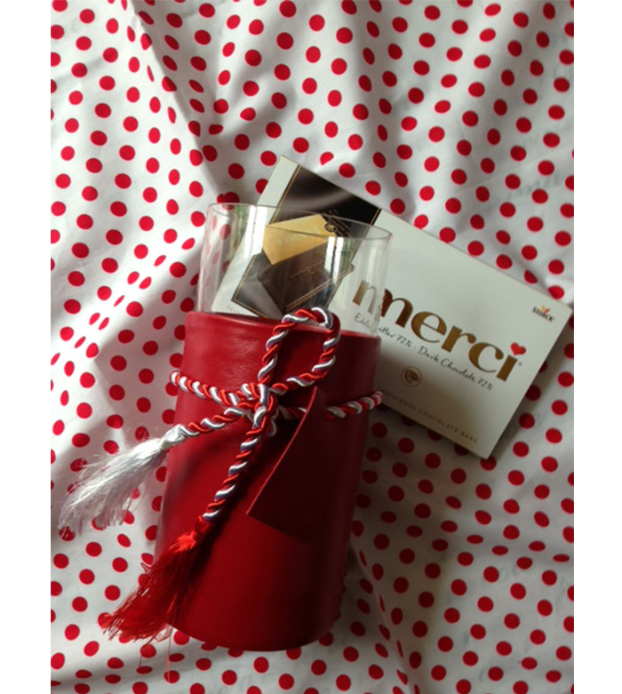 Caracteristici: cos rachita + vaza cilindrica din sticla transparenta + husa piele naturala + ciocolata