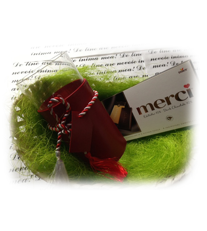 Caracteristici: cos rachita + vaza cilindrica din sticla transparenta + husa piele naturala + ciocolata